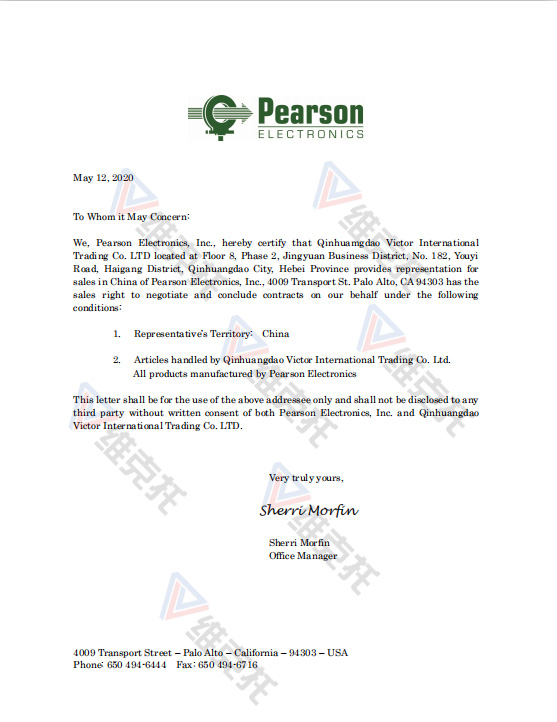 秦皇島維克托國際貿(mào)易有限公司于2020年5月12日取得了Pearson Electronics(皮爾遜電子)公司產(chǎn)品的代理權(quán)。我們是Pearson中國區(qū)代理商。主要代理產(chǎn)品有Pearson電流互感器、Pearson電流監(jiān)控器等。如果您有Pearson Electronics(皮爾遜電子)產(chǎn)品的采購需求,請與我們聯(lián)系,我們會竭誠為您服務(wù)!